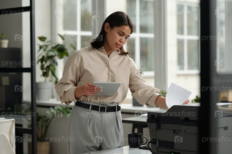 Молодая уверенная женщина-офисник в элегантном наряде печатает бумажные документы