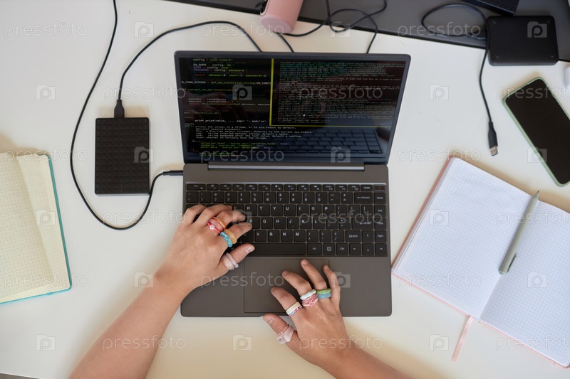 Выше вид студентки с кольцами на пальцах, использующей ноутбук