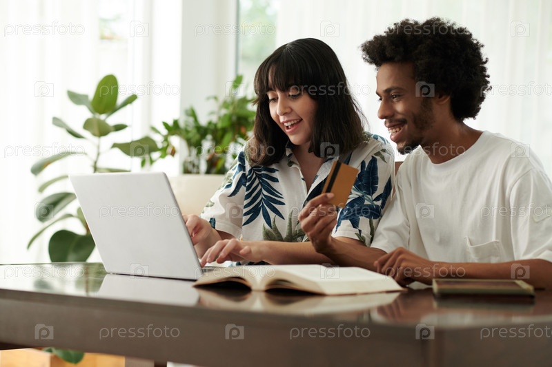 Счастливая молодая брюнетка выбирает товары в интернет-магазине со своим парнем