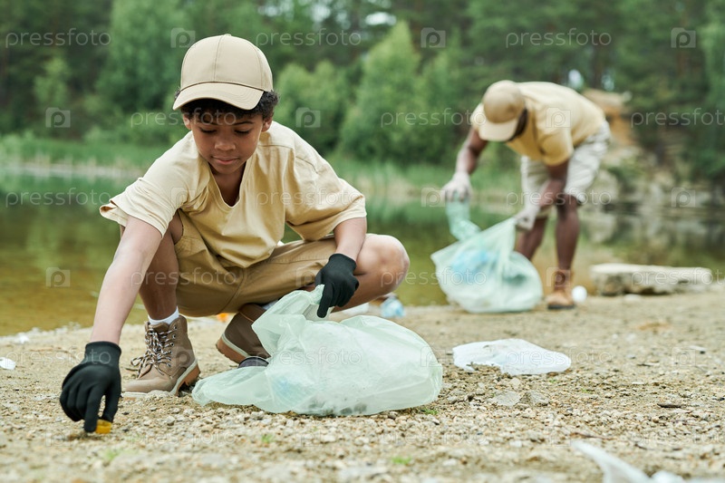 Ребенок убирает территорию вокруг озера