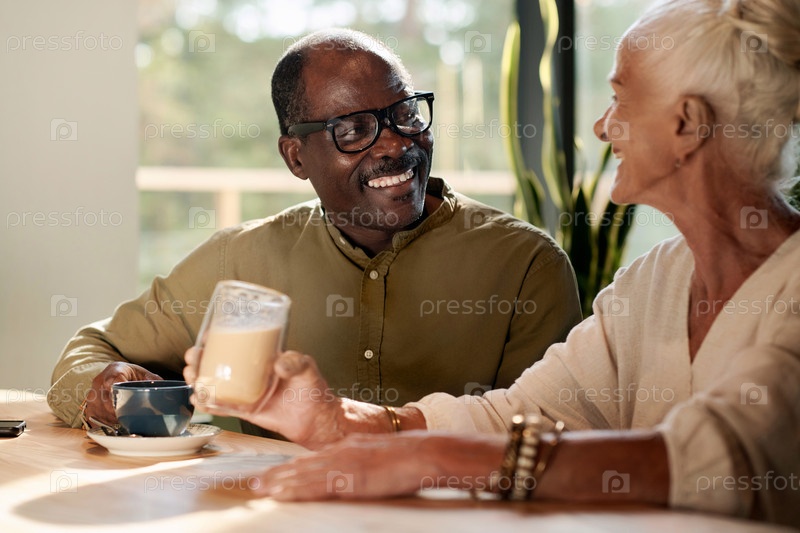 Старшая пара пьет кофе в кафе