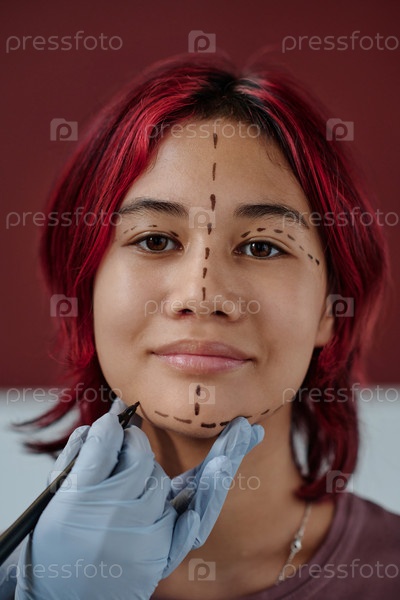Милая девушка смотрит на камеру, в то время как пластический хирург рисует лифтмарки на ее лице