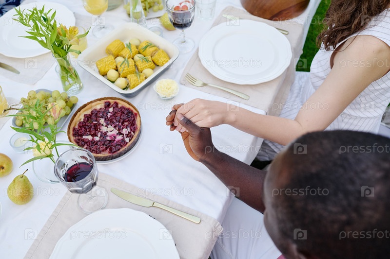 Выше угол рук межкультурного мужа и жены, сидящих за обслуживаемым столом