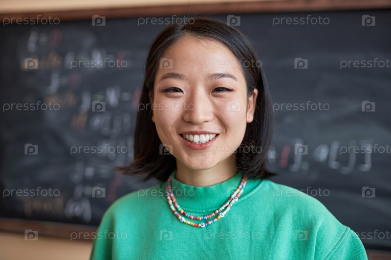 Лицо счастливого молодого азиатского учителя или студента в зеленом пуловере
