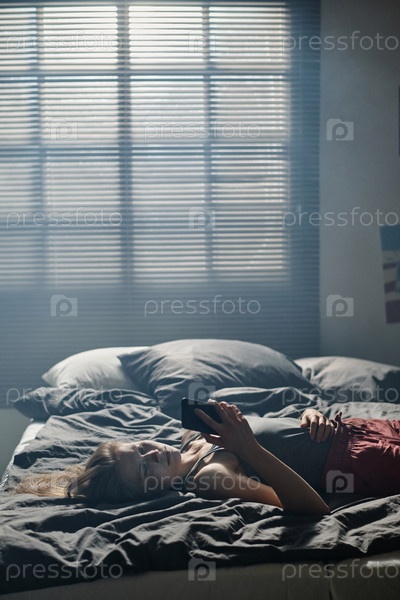 Стрессованная девушка страдает от киберзапугивания, лежа на кровати у окна
