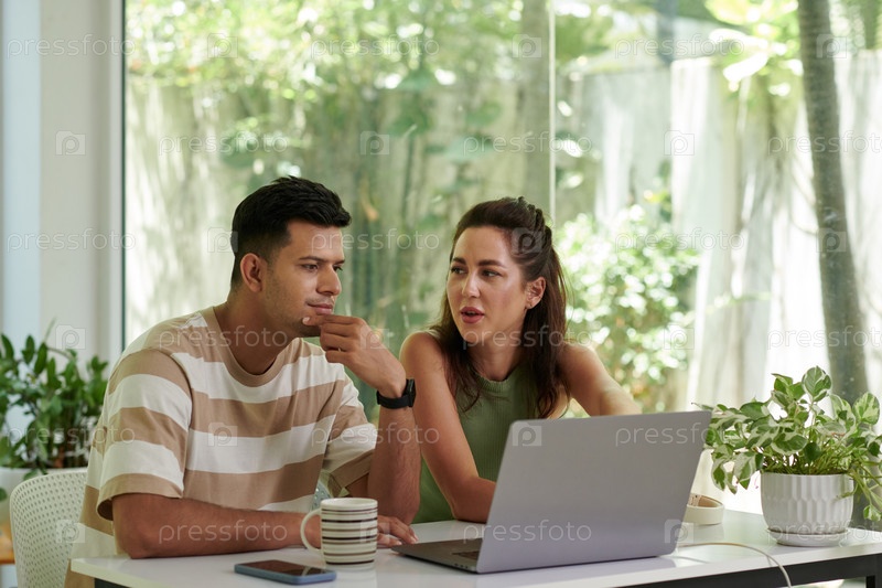 Молодая межкультурная пара сидит перед ноутбуком и обсуждает что-то