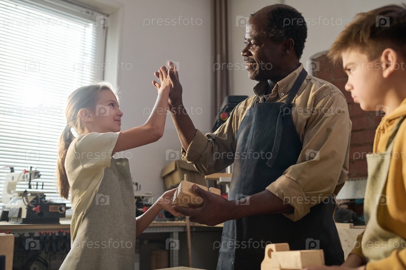 Улыбающаяся девушка выпустила пятерку со старшим плотником