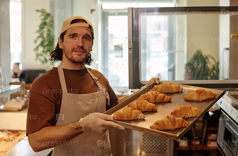 Рабочий пекарни демонстрирует свежие кондитерские изделия