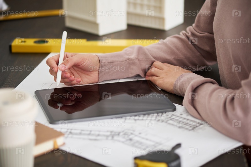 Рука молодой женщины-инженера или архитектора в синем пуловере, держащей стилус