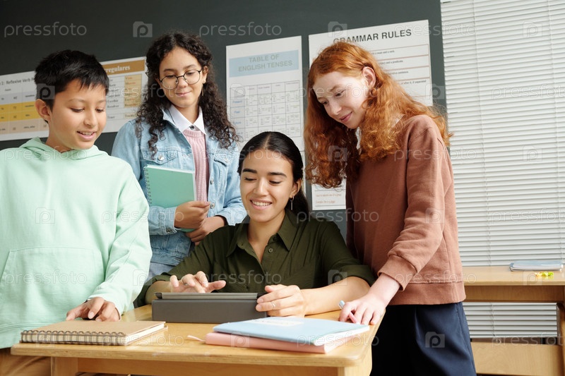 Молодая улыбающаяся учительница прокручивает онлайн-информацию на экране планшета