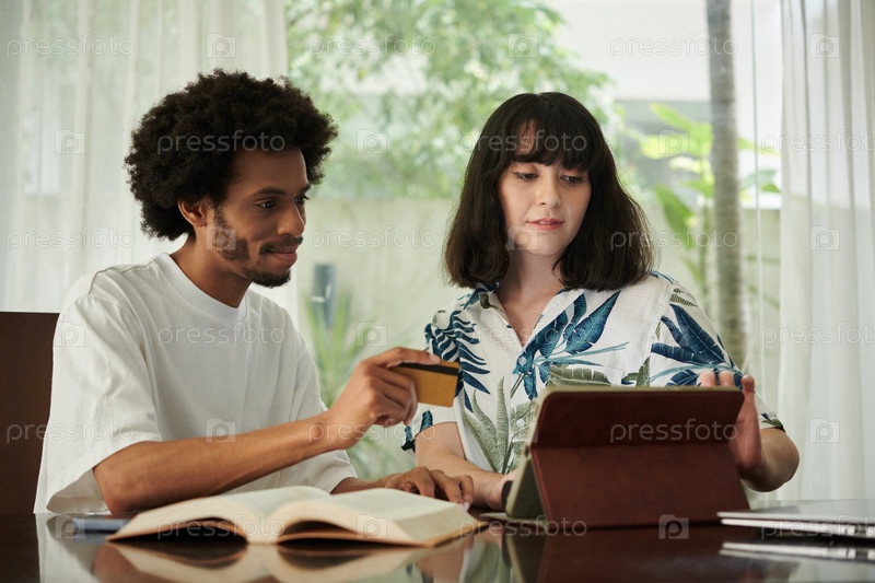 Молодой человек держит кредитную карту, а его жена вводит ее номер на сайте