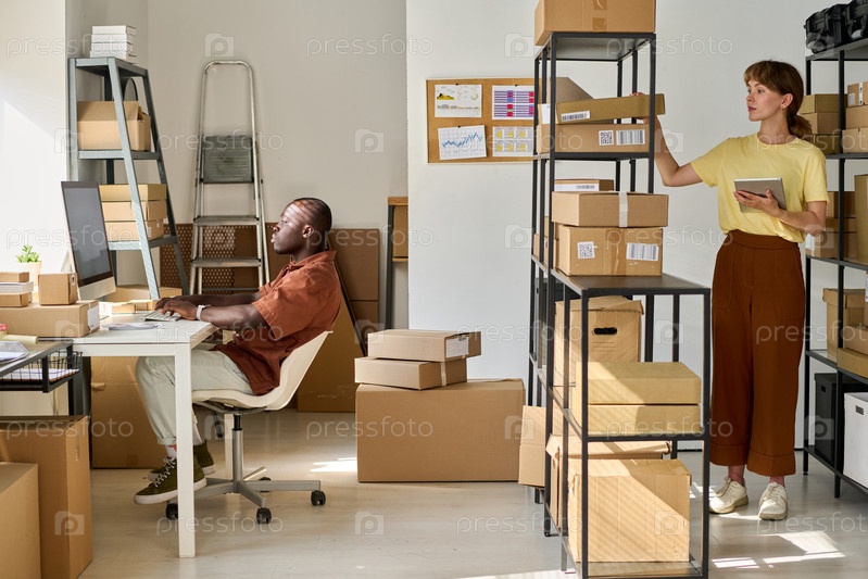 Длинный снимок двух молодых межкультурных работников рынка