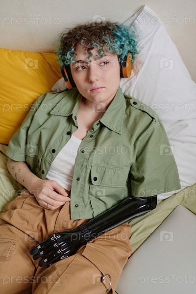 Уверенная девушка слушает подкаст в наушниках