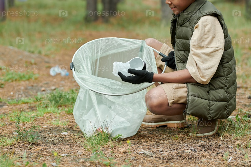 Мальчик кладет мусор в мешок на улице