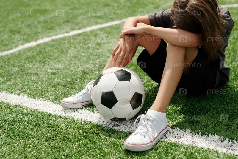 Усталый школьник в спортивной одежде сидит на зеленом футбольном поле и скрывает свое лицо
