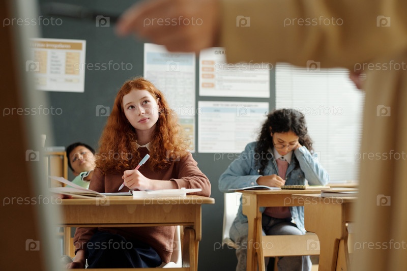 Умная школьница с ручкой слушает объяснения учителя и делает заметки