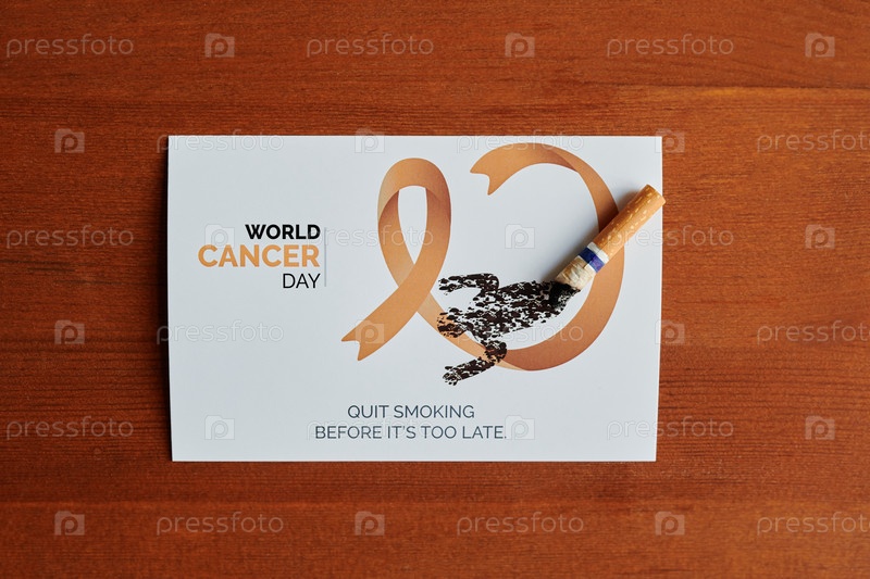 Снимок ручной открытки с лентой от рака легких, сигаретными задницами и лозунгом