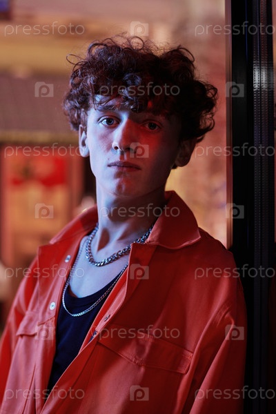 Кудрявый парень в модном оранжевом пиджаке и черном синглете смотрит на камеру