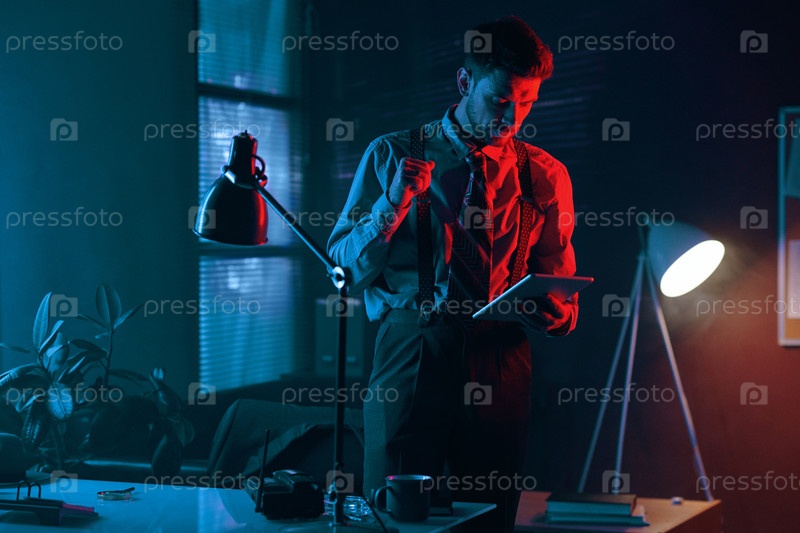 Молодой элегантный бизнесмен с планшетом, просматривающий электронные документы