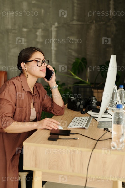 Молодая женщина, разговаривающая со своим смартфоном и просматривая новые снимки
