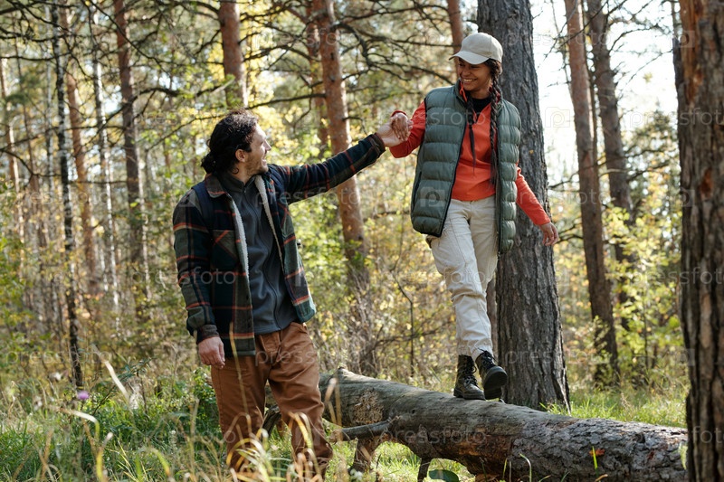 Счастливая молодая женщина, идущая по длинному сухому стволу сосны