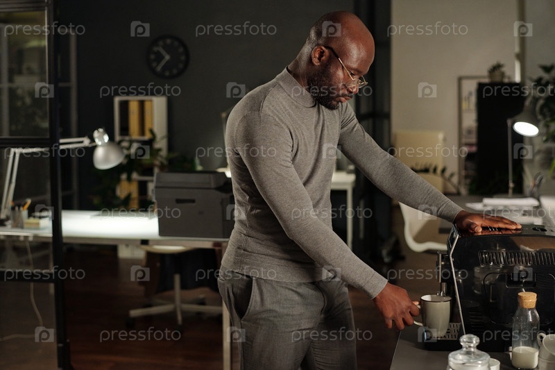 Молодой афроамериканский бизнесмен в сером башмаке делает кофе на машине