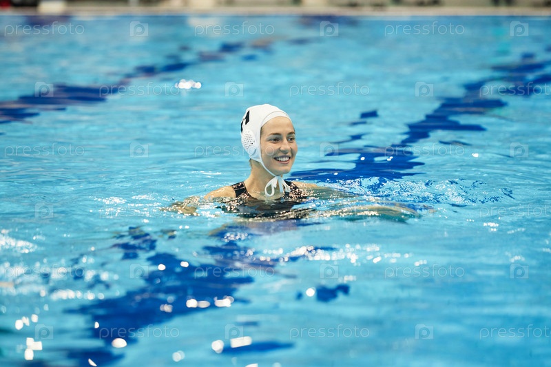 Голова юной улыбающейся женщины в купальной шляпе, стоящей в воде