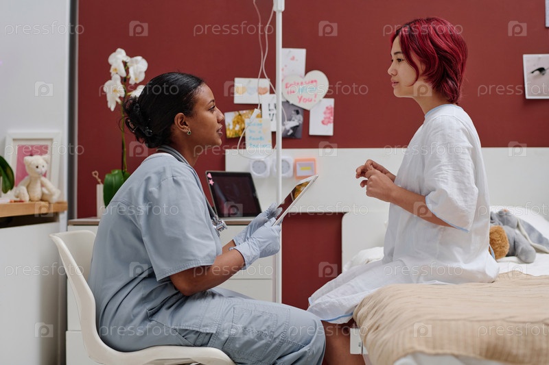 Боковой вид молодого афроамериканского хирурга, консультирующего подросткового пациента