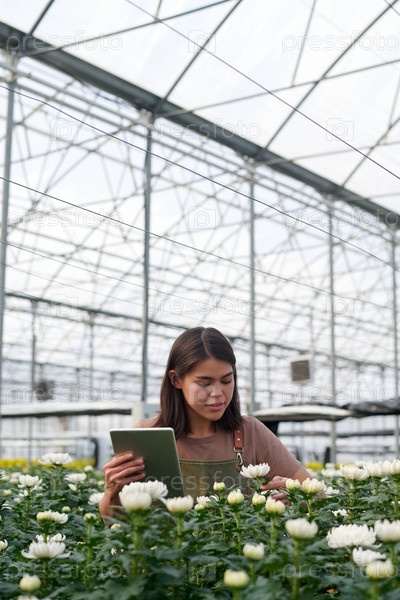 Молодая брюнетка с планшетом, касающаяся цветущего белого хризантема