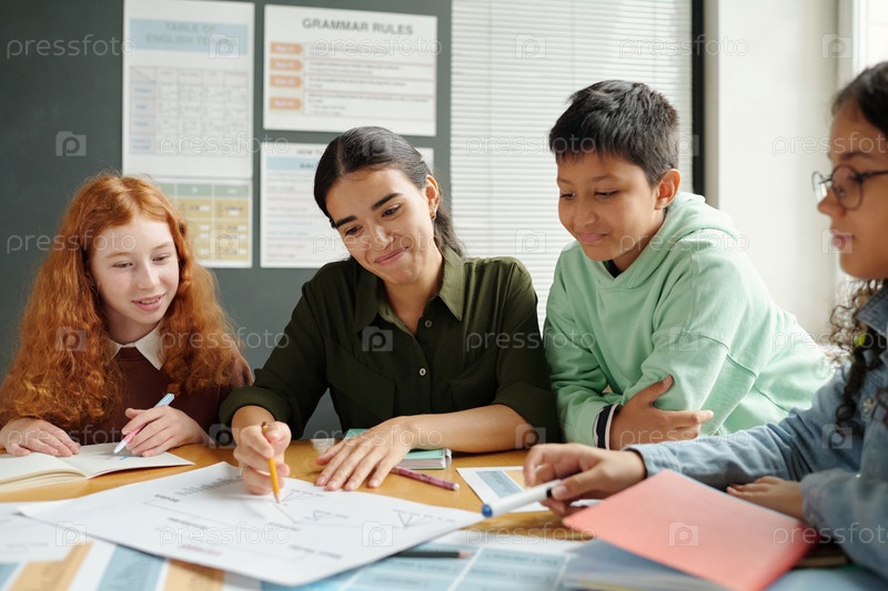 Уверенный учитель английского языка, указывающий на документ с правилами