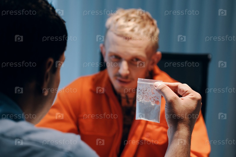 Детектив показывает мешок с белым порошком
