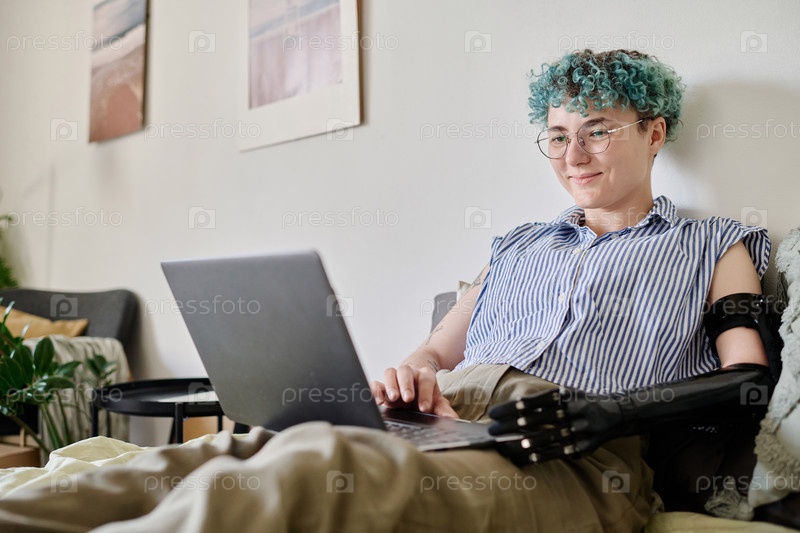 Девушка с ограниченными возможностями, использующая ноутбук дома