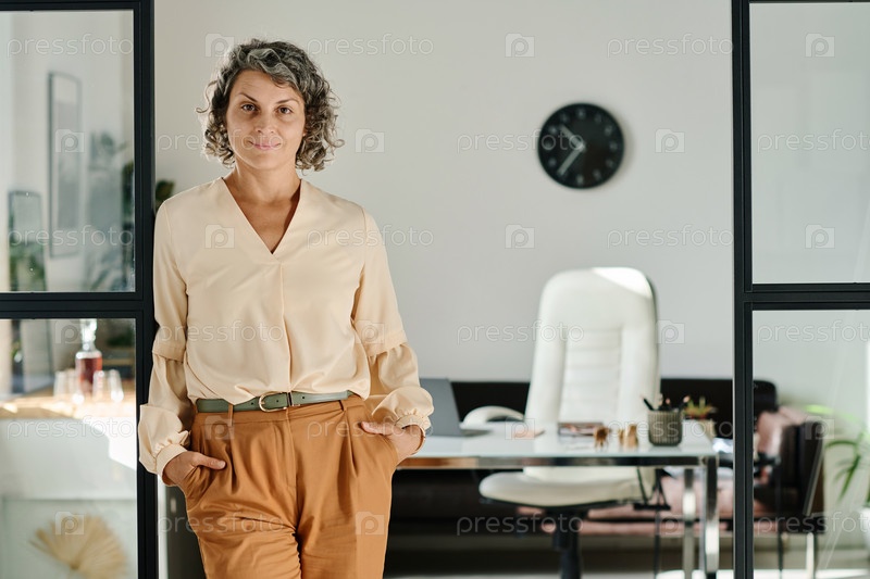Улыбающаяся зрелая женщина-главный исполнительный директор стоит в офисе