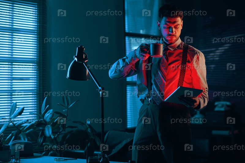 Молодой серьезный бизнесмен с чашкой чая или кофе, использующий планшет