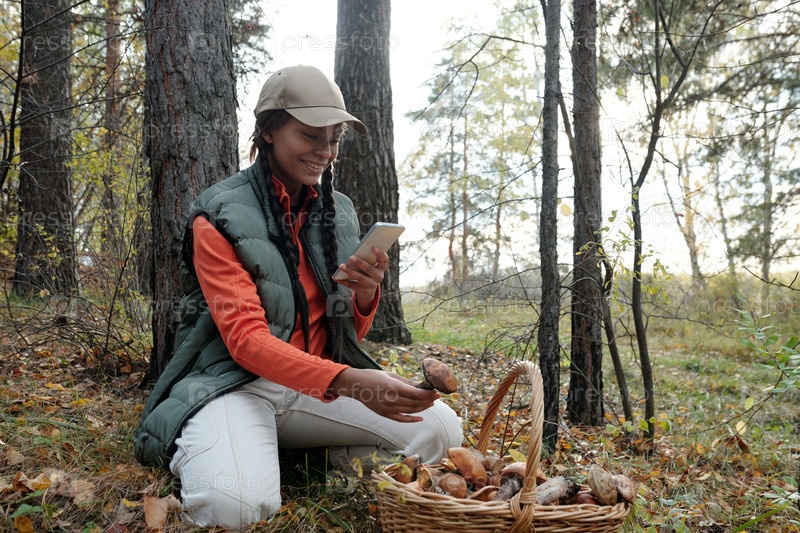 Счастливая молодая афроамериканская блогерша, фотографирующая собранные грибы