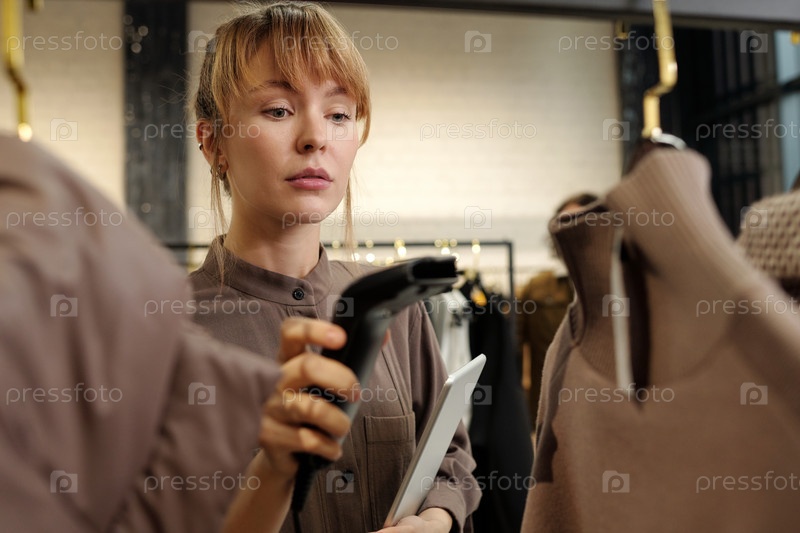 Молодая продавщица с планшетом и сканером проверяет информацию