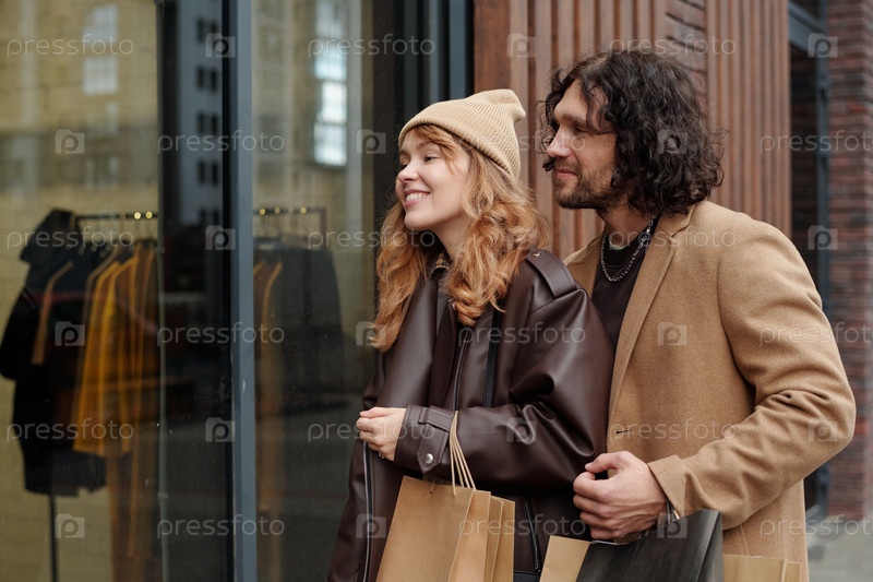 Счастливая молодая женщина и ее парень с бумажными пакетами смотрят в витрину