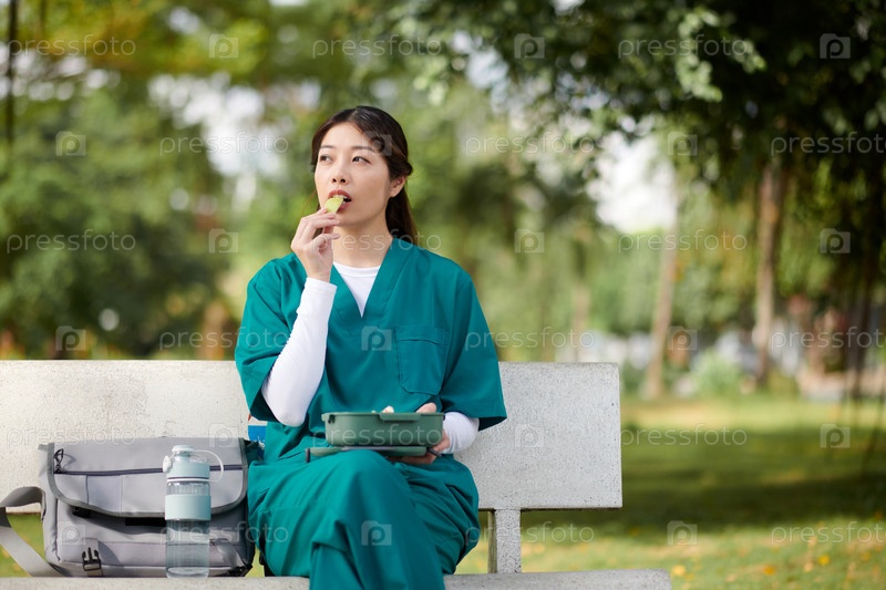 Медсестра ест на скамейке в парке