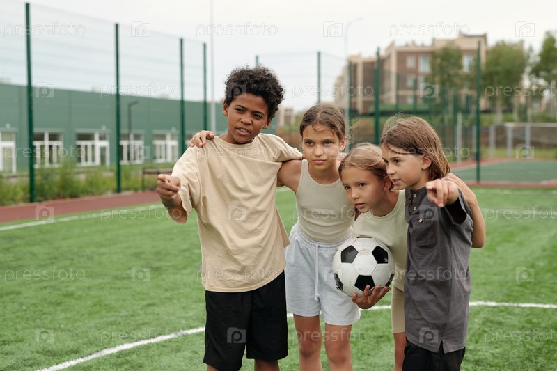 Милый школьник показывает вперед, объясняя своим одноклассникам правила игры