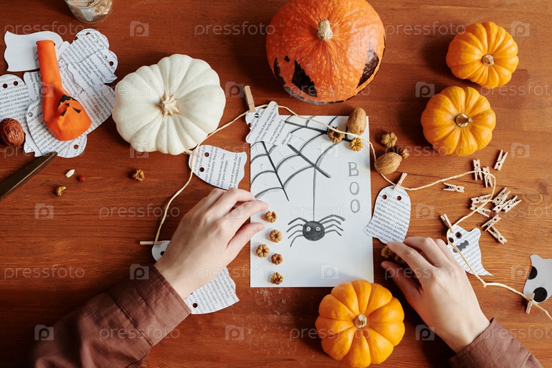 Руки неузнаваемой девушки кладут крошечные украшения на открытку Хэллоуина