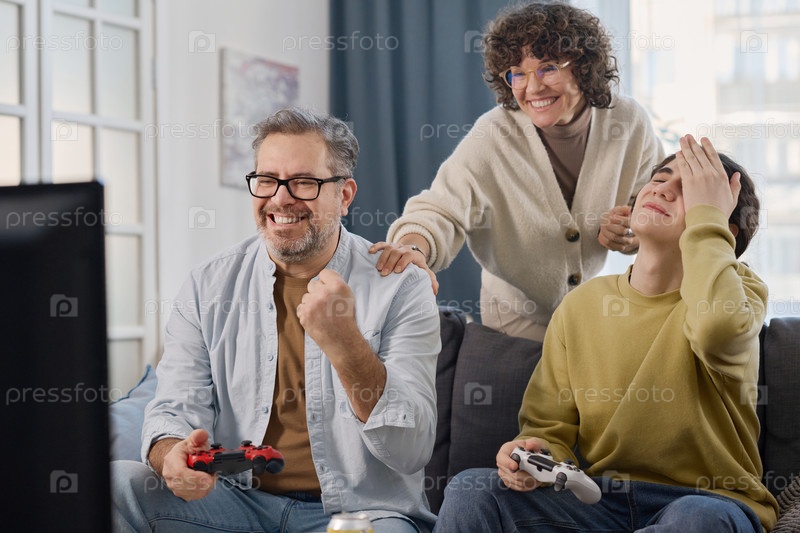 Семья играет в консольные игры дома