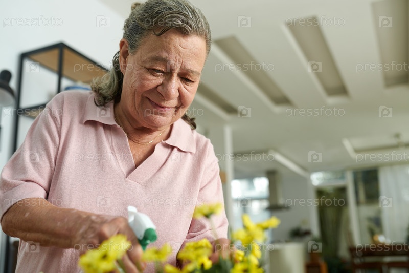 Старшая женщина, распыляющая цветы