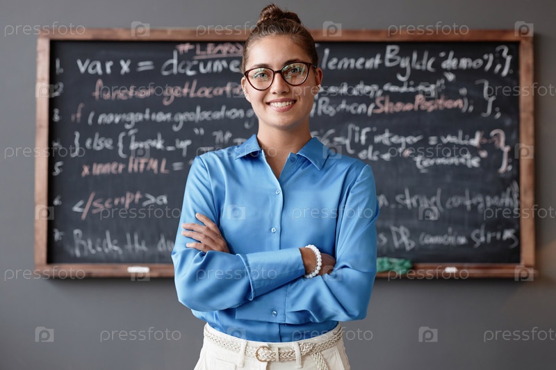 Молодая учительница стоит в классе