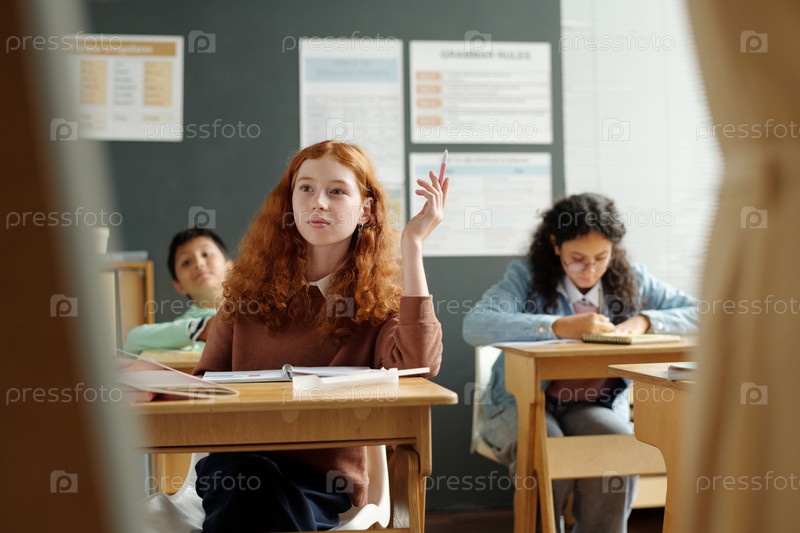 Умная школьница поднимает руку, сидя за столом и глядя на доску