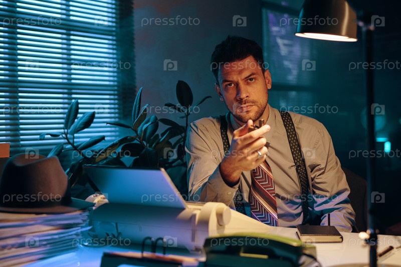 Молодой серьезный бизнесмен в формальной одежде смотрит на камеру по месту работы