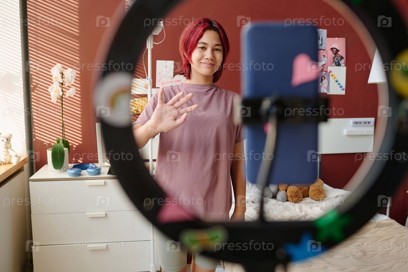 Милый улыбающийся подросток в фиолетовой футболке приветствует онлайн-аудиторию