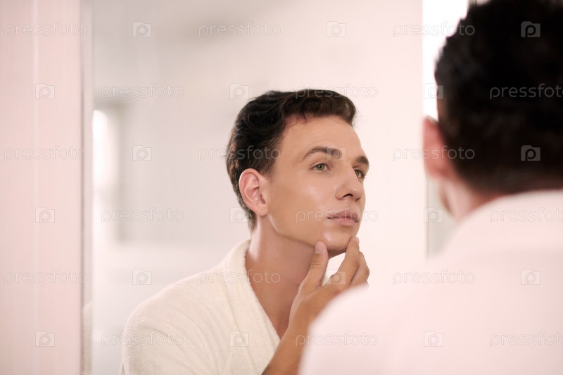 Молодой красавчик с гладкой и увлажненной кожей лица смотрит в зеркало
