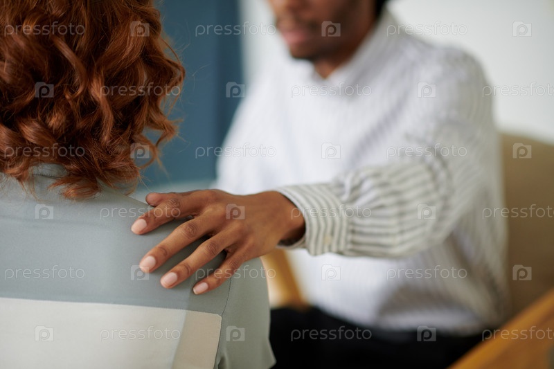Психотерапевт прикасается к плечу женщины