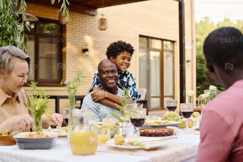 Веселый афроамериканский мальчик обнимает своего дедушку за ужином
