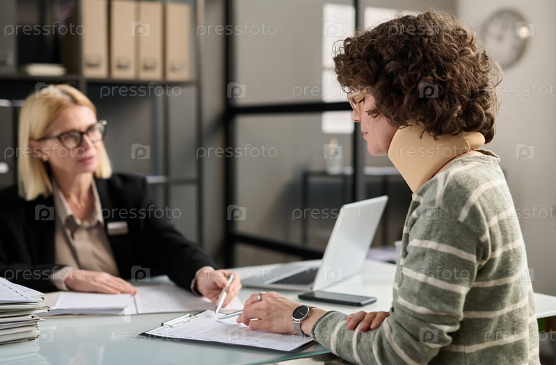Молодая женщина с травмой шеи заполняет документы
